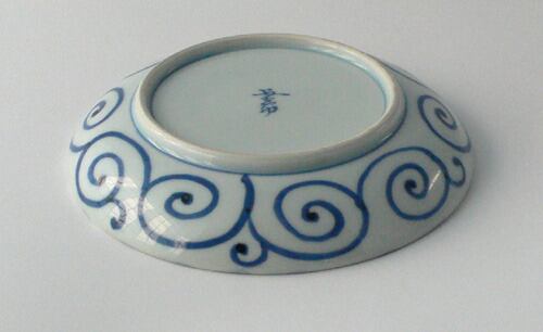 初期伊万里を想わせるようなタコ唐草の銘々皿です。 白磁と言うより淡い灰色のやわらかな釉薬が手描きの唐草を引き立てます。 径14cm h2.5cm 与志郎窯